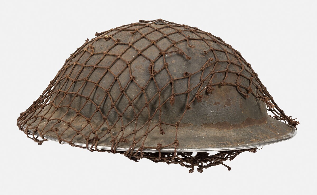 Engelse legerhelm met roest bruin camouflagenet. Het binnenwerk is van imitatieleer. Op de rand van de helm staat met krijt: "75".
