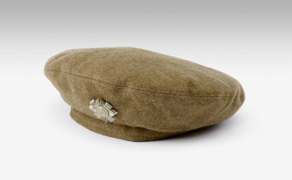 Lichtbruine baret van wol. Op de voorkant een zilverkleurig metalen embleem van de "Scots Guards Regiment" met de afbeelding van een distelbloem en de Latijnse randtekst: "Nemo me impune lassecit" (Niemand provoceert mij straffeloos). De binnenkant is gevoerd met groene, doorgestikte katoen met in het midden een stempel met: "7,5, London, 1944" en een onleesbare naam.