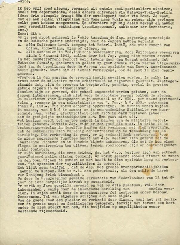 Illegale getypte brief met informatie uit Nederlands-Indië. Hij vangt aan met "Amice" Bij de brief een kattenbelletje getypt op dun papier met een waarschuwing. De tekst ervan is slecht leesbaar.