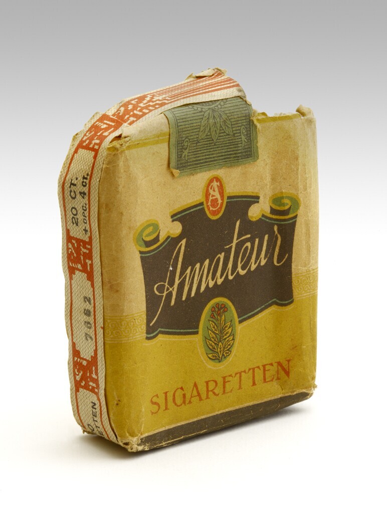 Een crèmekleurig geopend pakje Amateur sigaretten met zwarte en rode opdruk. Een deel van de banderol en de sluitzegel is aanwezig. Onder de merknaam in een ovaal kader de afbeelding van een tabaksplant. Op de achterkant in een verbod de sigaretten te verhandelen.