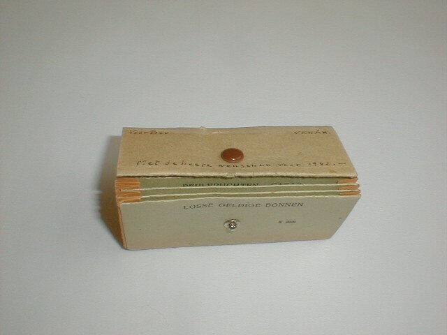 Een lichtgroen opbergmapje met een bruine drukknoopsluiting. Op de sluiting staat met pen geschreven: "Voor Boo van An met de beste wenschen voor 1942". Opengeklapt heeft het mapje zeven lichtgroene opbergvakjes met bruine zijkanten. Op de vakjes staat gedrukt welke bonnen hierin kunnen worden opgeborgen: "Losse geldige bonnen' k 2009/jam, stroop e.d.; fijne vleeswaren - vlees/zeep-scheerzeep-soda; aardappelen-brandstoffen/koffie-thee-suiker; peulvruchten-cacao/maïzena-vermicelli-pudding; rijst-havermout-gort/kaas-eieren-melk; kaas-eieren-melk/boter-vet-olie; boter-vet-olie/brood-bloem-gebak en brood-bloem-gebak". In de vakken zitten nog enkele distributiebonnen.