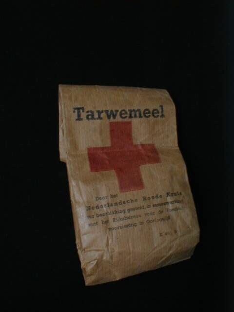 Papieren zakje voor tarwemeel ter beschikking gesteld door het "Rode Kruis". Op het zakje het logo van het Rode Kruis. Daarboven in zwart: "Tarwemeel" en onder: "Door het Nederlandsche Roode Kruis ter beschikking gesteld in samenwerking met het Rijksbureau voor de Voedselvoorziening in Oorlogstijd.