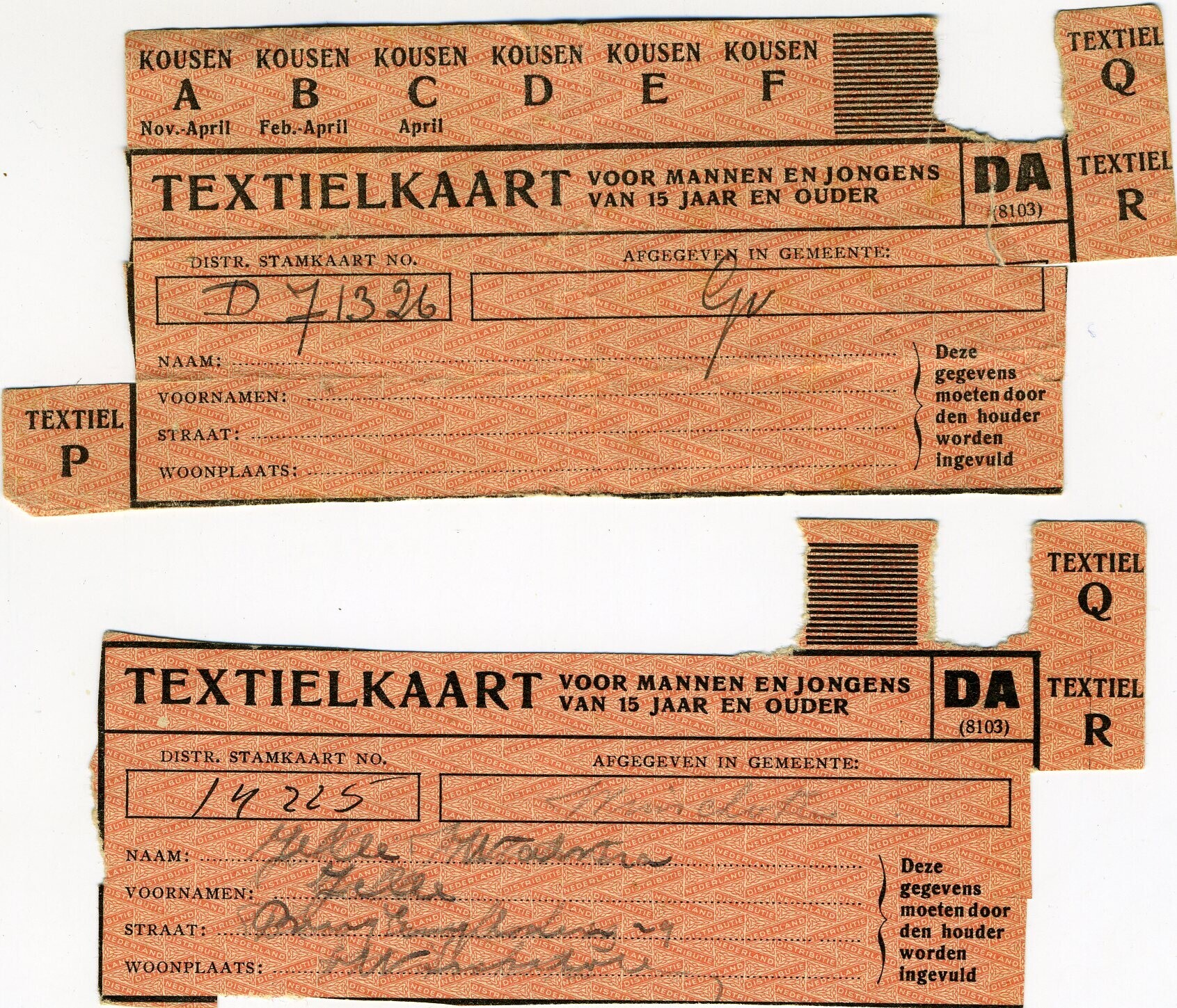 Twee gebruikte Textielkaarten voor mannen en jongens van 15 jaar en ouder. Er zijn bonnen voor kousen en textiel. Een van de bonnen heeft op de achterkant een stempel van Distributie Kringbureau No. 82 Winschoten.