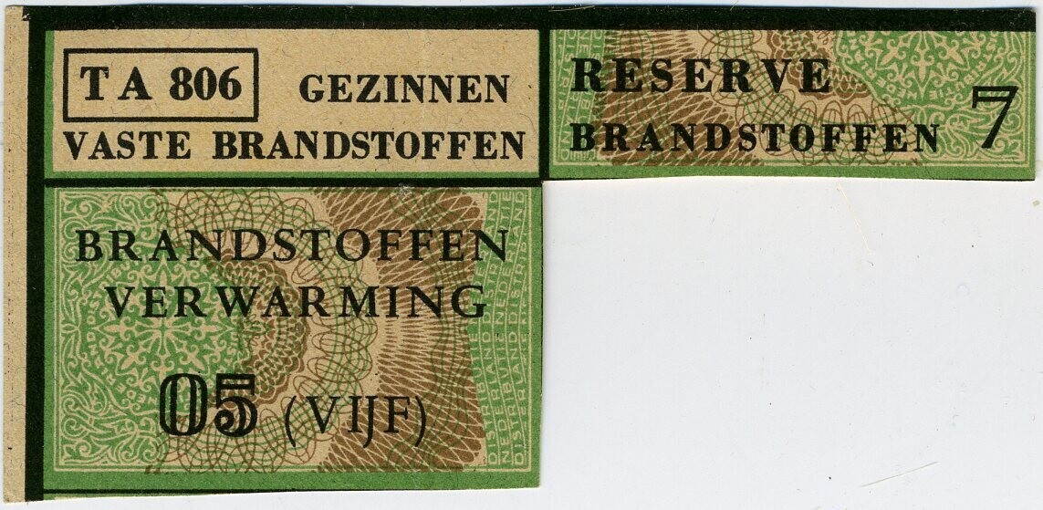 Twee groenbruine gebruikte Bonkaarten TA 806 voor het verkrijgen van vaste brandstoffen voor gezinnen.