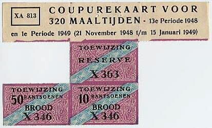 Een gebruikte paarsblauwe coupurekaart voor 320 maaltijden voor de dertiende periode 1948 en eerste periode 1949. De bonnen zijn voor de toewijzing van brood, bloem en suiker.