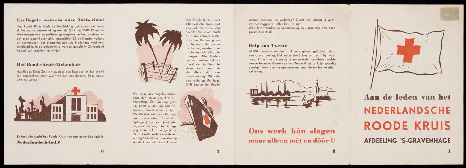 Geïllustreerd foldertje aan de leden van de Haagse afdeling van het Rode Kruis over de activiteiten van het Nederlandse Rode Kruis: repatriëring, informatie over familie in binnen- en buitenland, levensmiddelenuitdeling, vakantie voor illegale werkers in Zwitserland, ziekenhuis, medische hulp in Nederlands-Indië, hulp aan Twente bij een overstroming.