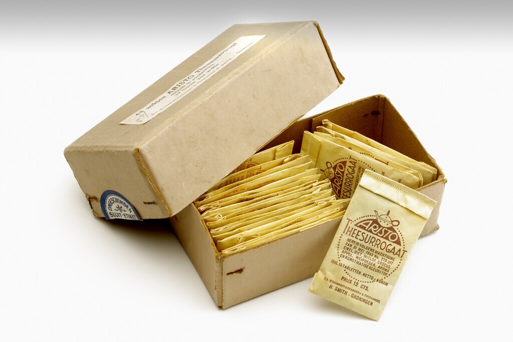 Een kartonnen doos met 26 zakjes 'Aristo theesurrogaat'.