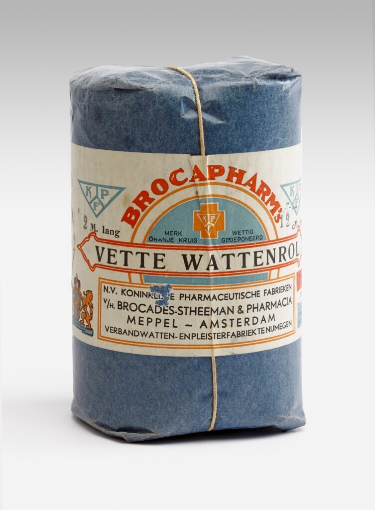 Een blauw papieren verpakking vastgebonden met en touwtje met daarover een etiket waarop o.a.: "Brocapharm vette wattenrol. N.V. Koninklijke Pharmaceutische Fabriken v/h. Brocades-Stheeman & Pharmacia Meppel-Amsterdam verbandwatten en pleisterfabriek te Nijmegen".