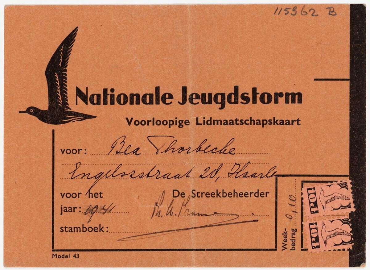 Een oranje "Voorloopige Lidmaatschapskaart" van de Nationale Jeugdstorm op naam van Bea Thorbecke. Aan de voorzijde links de afbeelding van een meeuw, het symbool van de Jeugdstorm; daarnaast een kader met:' Nationale Jeugdstorm', Voorloopige Lidmaatschapskaart' en met pen geschreven de naam en het adres van de houder. Rechts in de hoek twee spaarzegels. aan de achterzijde het spaargedeelte waarvan de laatste zeven hokjes beplakt zijn.