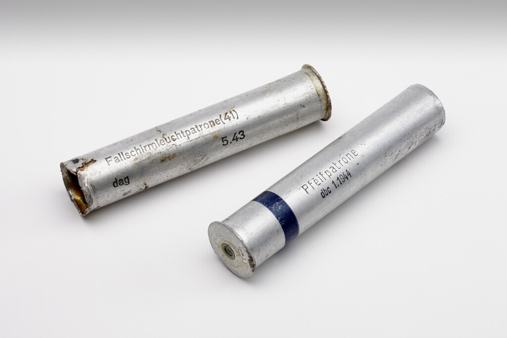 Twee hulzen van lichtspoorkogels. Op één o.a.: "Fallschirmleuchtpatrone" en op de andere o.a.: "Pfeifpatrone 1.1944".
