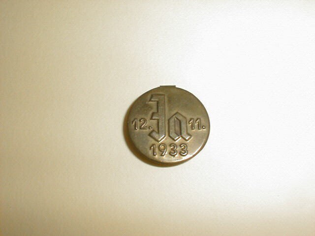 Koperkleurig metalen propagandaspeldje van de Nationaal Sozialistische Deutsche Arbeiter Partei (NSDAP). Op de achterkant een lipje waarmee het op de kleding kan worden vastgezet. Op de voorkant in reliëf: "Ja" tussen de datum: "12-11-1933". Verkiezingen voor de Rijksdag vonden op 12 november 1933 plaats. Op de verkiezingslijst stonden alleen leden van de NSDAP. Er kon alleen maar voor of tegen worden gestemd. Het werd duidelijk gemaakt dat niet stemmen of tegenstemmen gelijk stond met verraad.