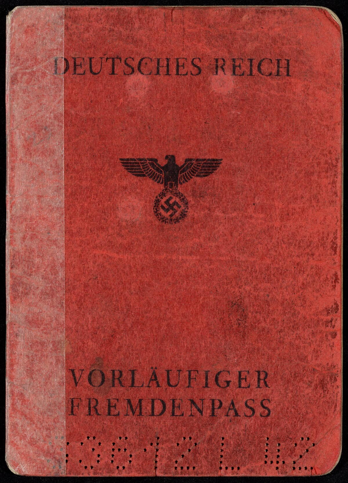 Een paspoort met rode kaft en daarop gedrukt: "Deutches Reich Vorläufiger Fremdenpass" en het symbool van het Duitse Rijk: de rijksadelaar met hakenkruis. Het paspoort was uitgereikt aan Albert Ditz met verschillende verlengingen.
