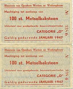 Twee bonnen voor het verkrijgen van 100 st. metselbaksteen. Machtiging uitgegeven door het Ministerie van Openbare Werken en Wederopbouw