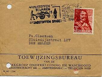 Envelop van het "Toewijzingsbureau van de vakgroep onderkleeding en waschgoed" met daarop een postzegel van Michiel de Ruyter en poststempels met propaganda-teksten. Drie knipsels van de poststempels met onder andere de tekst ''Frontzorg is eereplicht'' en ''Afvalstoffen bewaren is grondstoffen sparen.''