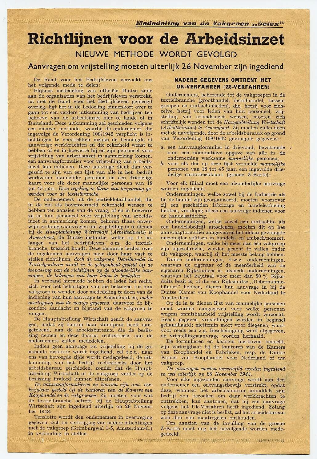 Aan twee zijden bedrukt mededelingenblad van de vakgroep "Detex" met bovenaan: "Richtlijnen voor de Arbeidsinzet. Nieuwe methode wordt gevolgd. Aanvragen om vrijstelling moeten uiterlijk 26 November zijn ingediend". Het document is opgevouwen als poststuk verstuurd aan F.J. Claessen te Den Helder.