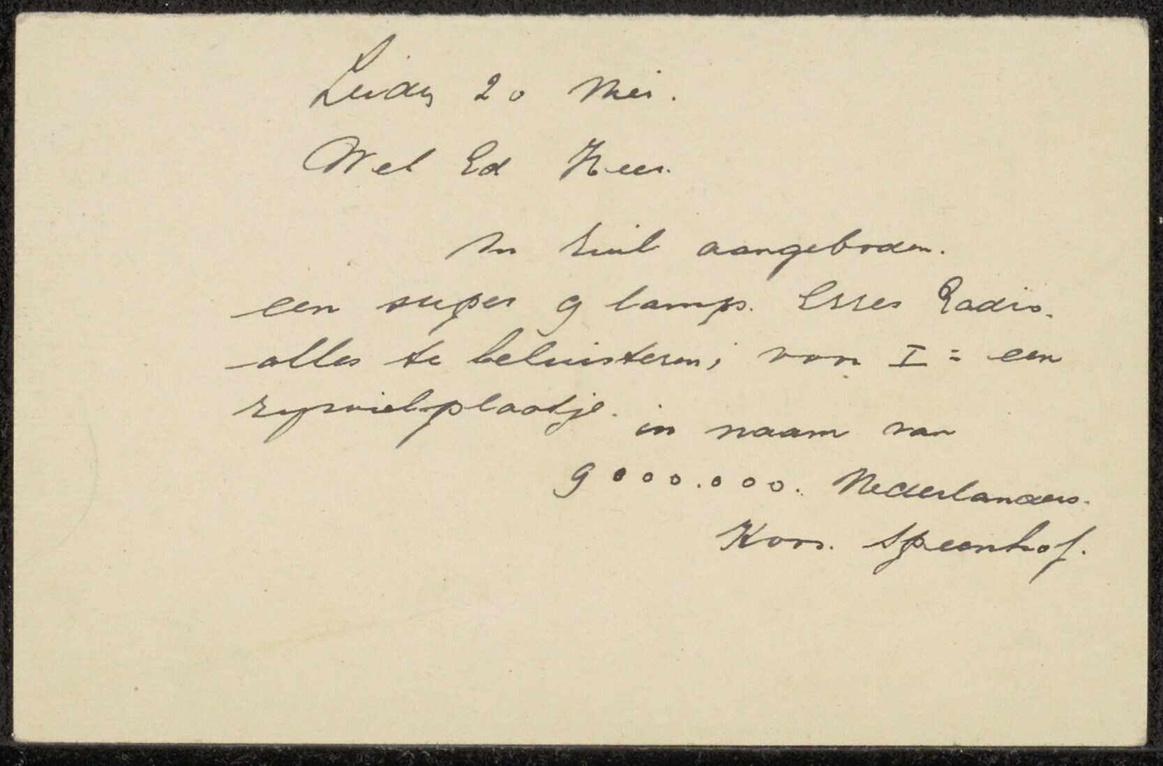 Een "Antwoord-briefkaart" met een in zwarte inkt geschreven tekst gedateerd 20 mei. De tekst luidt: ''In ruil aangeboden een super 9 lamps Erres Radio, alles te beluisteren voor 1 = een rijwielplaatje. In naam van 9.000.000 Nederlanders. Koos Speenhof.'' Op de achterzijde staat als afzender vermeld: "W. van Oranje. Nederland." Geadresseerd aan: ''de Leider A. Mussert, N.T.B''. Het poststempel is van 27 mei 1943.