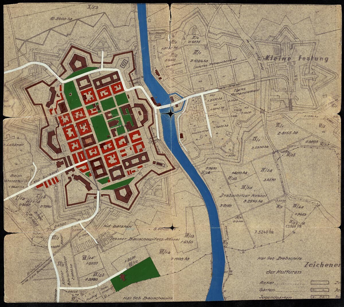 Met groen, bruin, rood en blauw ingekleurde plattegrond van de vesting Theresienstadt en directe omgeving.