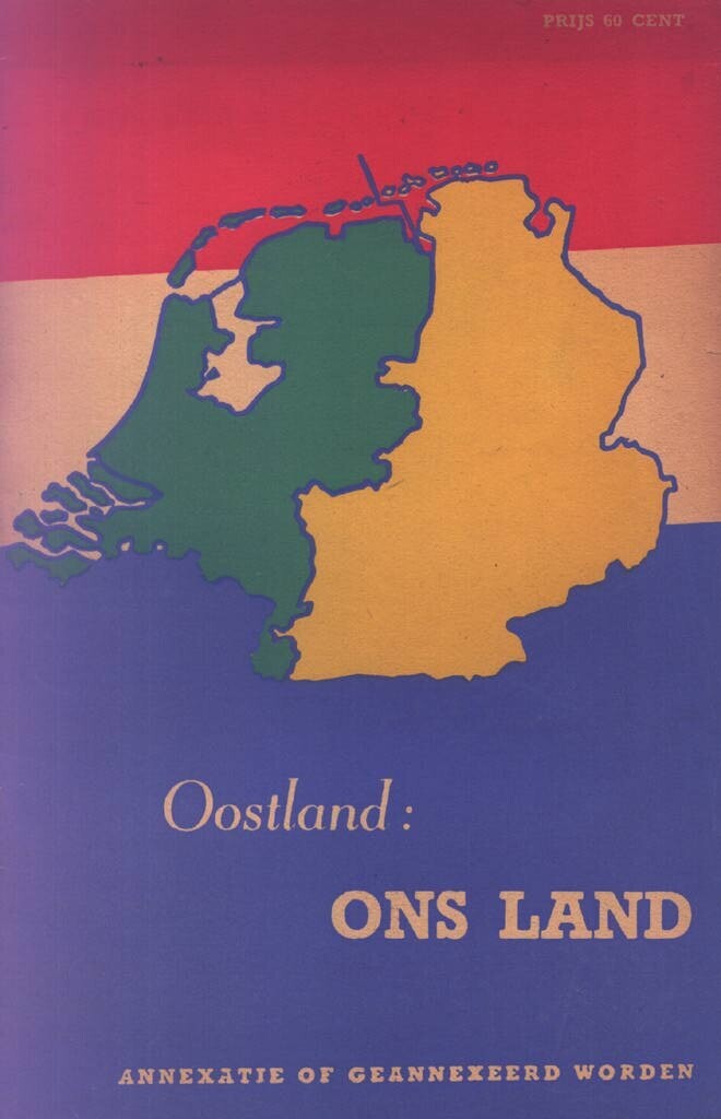 Twee boeken over de noodzaak van grenscorrecties ten koste van Duitsland. De voorkant is in rood-wit-blauw uitgevoerd met daar overheen in groen de kaart van Nederland met in geel het te annexeren deel van Duitsland. Op de achterkant een Nederlandse vlag met daarop de Nederlandse leeuw die een Duitse soldaat een schop geeft. De boeken omvatten 29 pagina's.