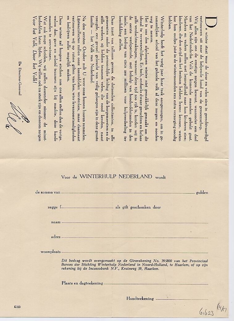 Document met een oproep om geld te schenken t.b.v. de Winterhulp Nederland en een formulier dat aan de organisatie kan worden geretourneerd met daarop het bedrag dat wordt gegeven. Het bestaat uit een in tweeën gevouwen vel papier. Op de buitenkant het logo van de Winterhulp. De originele envelop met het logo van de Winterhulp is bijgevoegd.