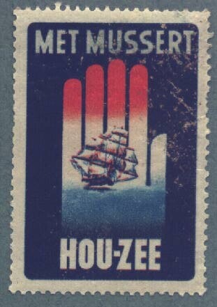 Zegel met daarop de afbeelding van een rood-wit-blauwe hand met daarin een zeilschip en de tekst: "Met Mussert Hou-zee".