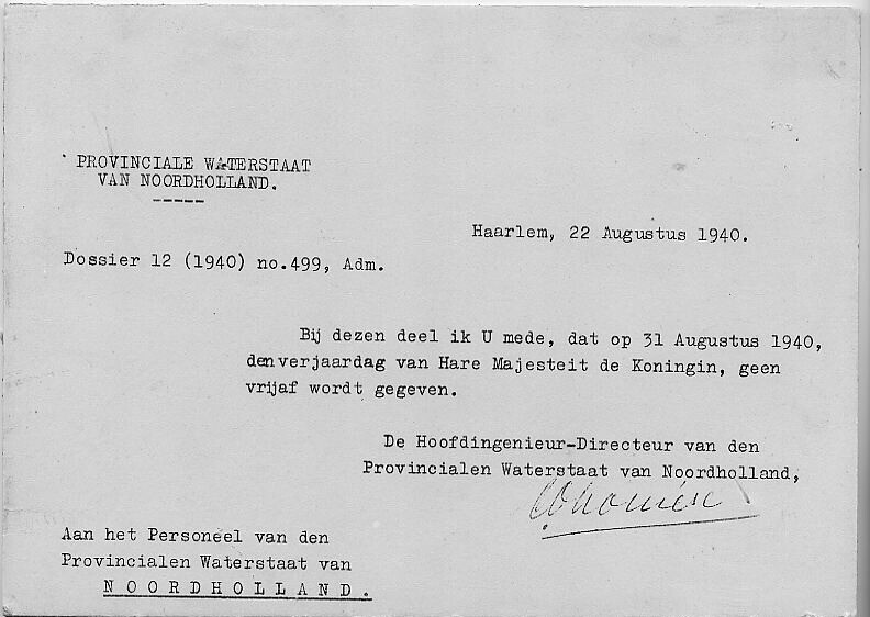 Gestencild document gedateerd 22 augustus 1940, waarin het personeel van de Provinciale Waterstaat van Noord-Holland wordt meegedeeld dat er op Koninginnedag geen vrijaf wordt gegeven.
