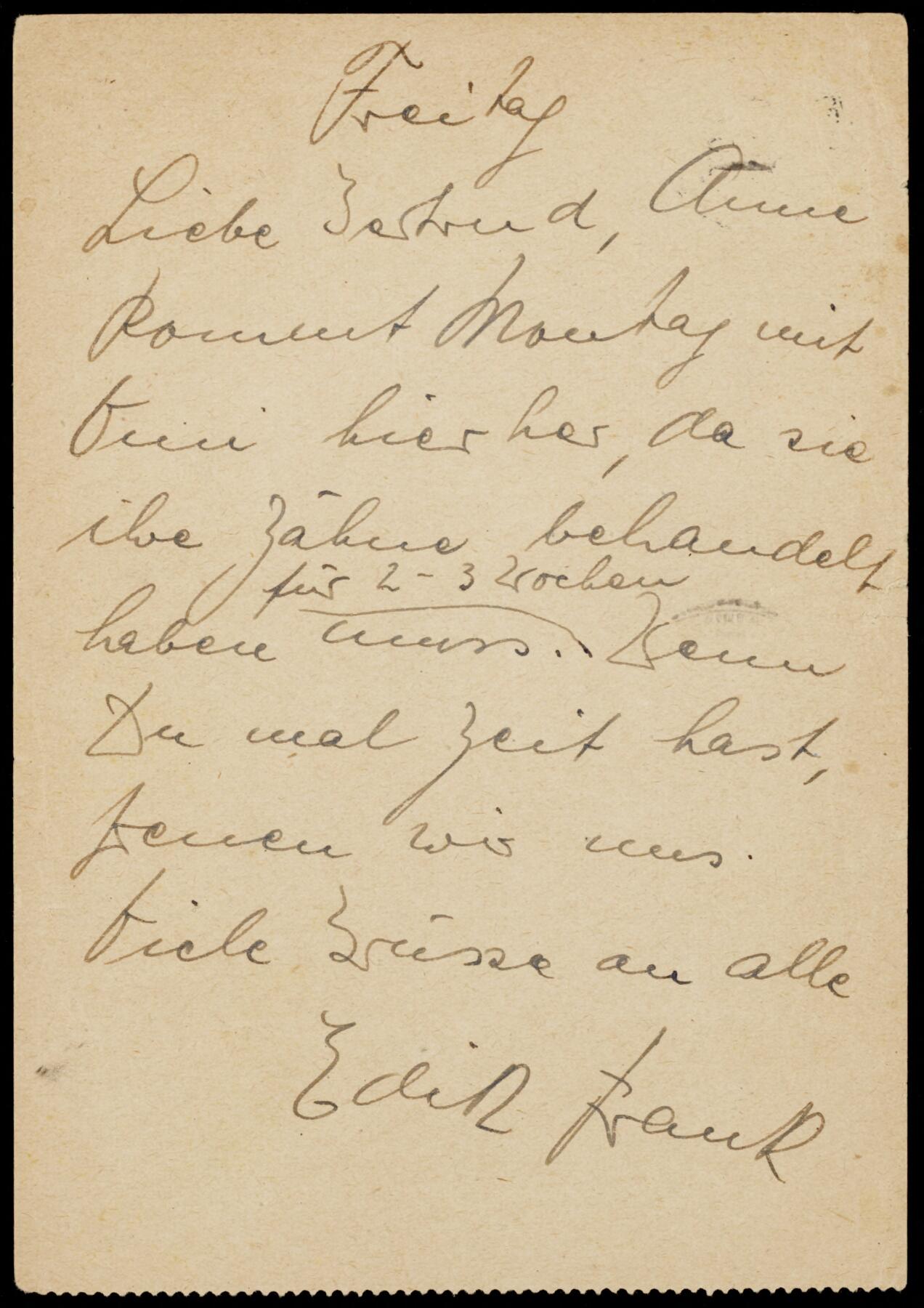 Kaart van Edith Frank-Holländer aan Gertrud Trenz-Naumann (Gertrud Naumann, later gehuwd met Karl Trenz, was het buurmeisje van de familie Frank aan de Marbachweg in Frankfurt am Main), met inhoud van persoonlijke aard, geschreven in Aken op 16 november 1933