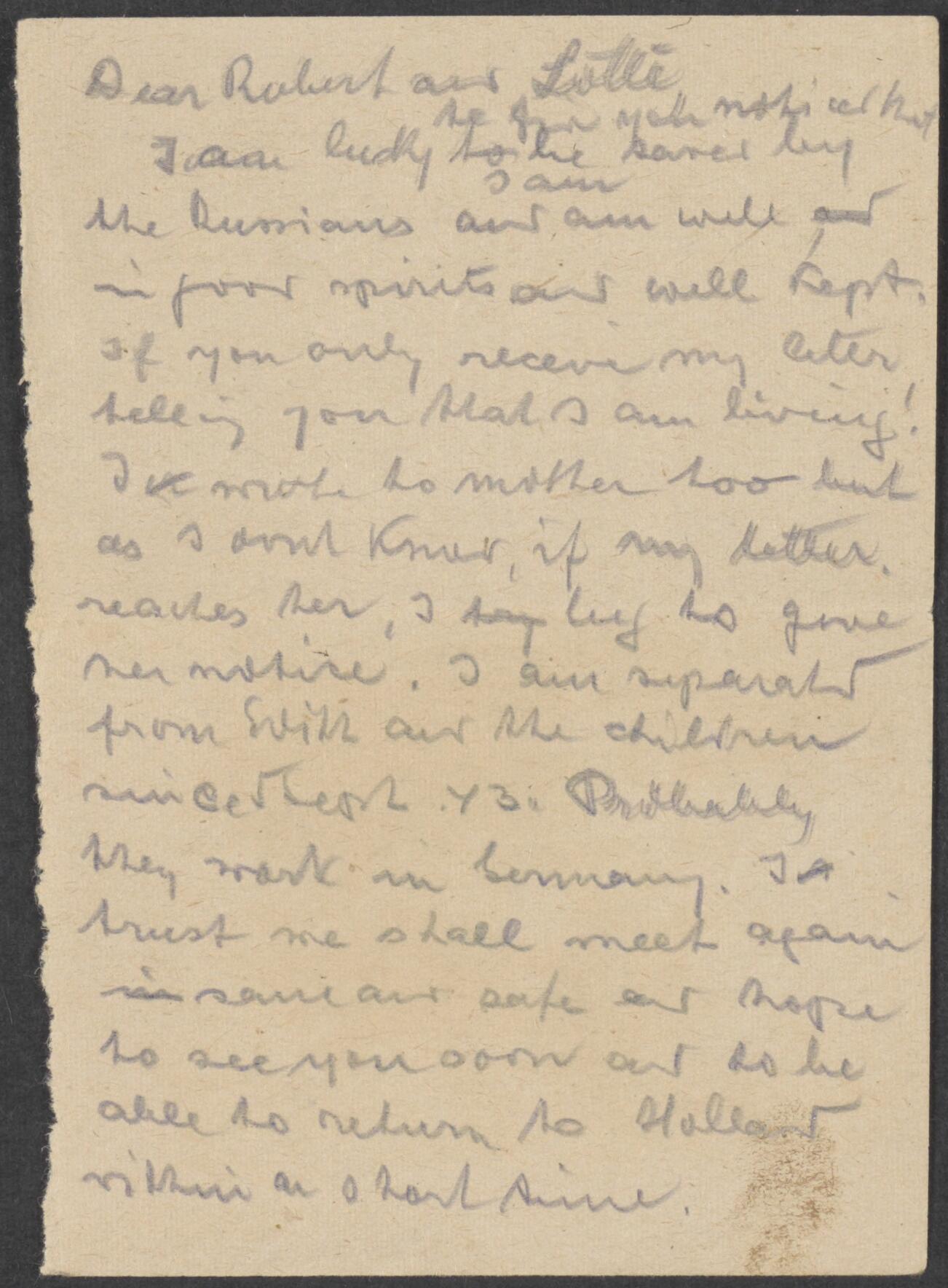 Facsimile van een concept brief geschreven door Otto Frank: Tekst o.a. Dear Robert and Lottie I am lucky to have been saved by the Russians ....don't worry about me anymore ...yours