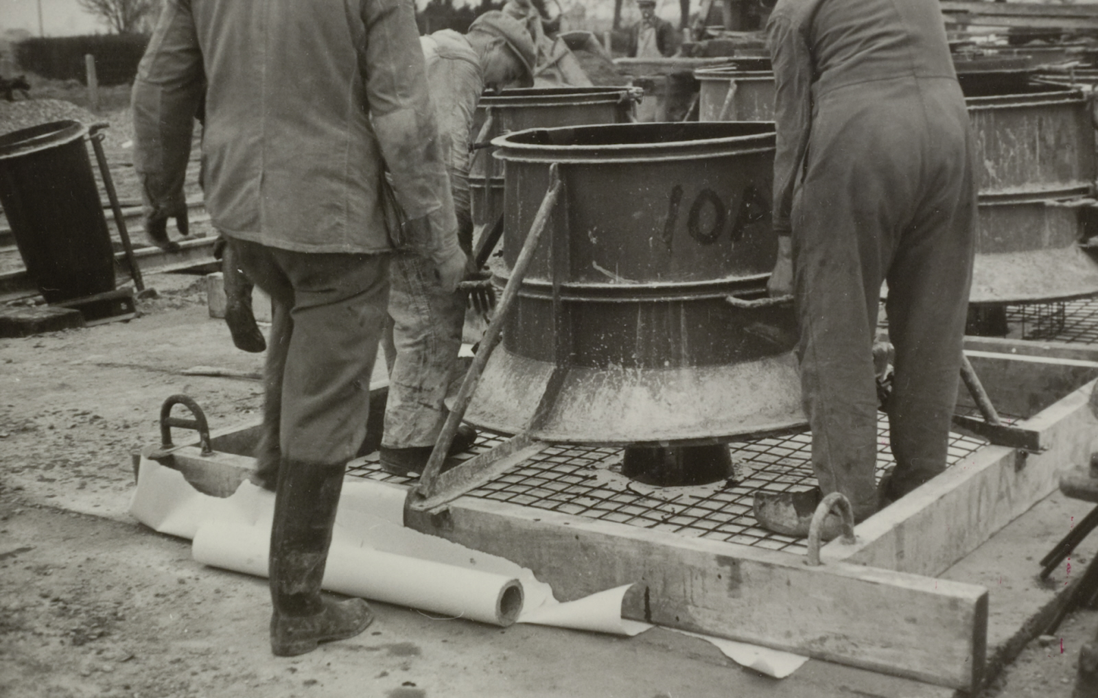 Op bruin papier geplakte afbeelding in zwart-wit van een opgetilde spoorstaven met een welplaatje ertussen. Om de spoorstaven zitten klemmen en er wordt een vorm om de staven aangebracht. Deze werkzaamheden worden uitgevoerd ten behoeve van laswerkzaamheden aan het spoor. Onder de foto is met zwarte pen het nummer 134-30 en de titel 'Vorm wordt om de lasplaat geplaatst' geschreven. Naast en onder de foto is vijf keer met een blauwe stempel 'geen negatief' aangebracht. Achterop de foto is met zwarte pen geschreven 'Vorm wordt om de lasplaat geplaatst' en het nummer 'F134-30' geschreven. Ook is de titel nogmaals met grijs potlood geschreven.