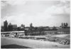 Op bruin papier geplakte afbeelding in zwart-wit van een man die op het perron van station Bergen op Zoom staat. Hij waarschuwt een jongen die te dicht op de rand van het perron staat. Bij het perron staat een elektrisch treinstel met een 2e klasse coupé. Naast de man staat een meisje met een koffer.