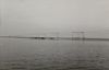 Op bruin papier geplakte afbeelding in zwart-wit van een scheve portaal bij Lage Zwaluwe. Op de voorgrond ligt droog gebied, op de achtergrond ligt overstroomd gebied. Tussen het droge en overstroomde gebied ligt het spoor.