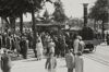 Stoomlocomotief 'De Arend' in de straten van Delft met een conducteur en een heer
