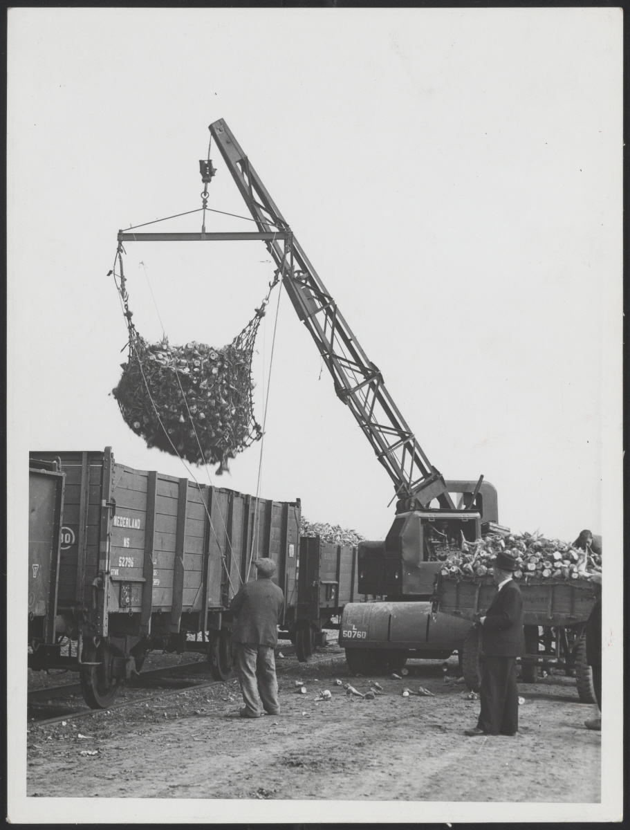 Foto in zwart-wit van de overslag van suikerbieten uit een treinwagen. De foto is in 'Nieuw Spoor' afgedrukt in de editie van december 1947 bij een artikel over het transport en de verwerking van suikerbieten. Achterop de foto is met een blauw stempel van 'Foto Persbureau Stevens' en is met een blauwe pen geschreven: 'Nieuw Spoor 19, pag. 16.' en enige afmetingen van de foto.