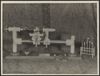 Foto in het zwart wit van meubilair in een ruimte bij de Gouden Handen tentoonstelling in Ede. Deze tentoonstelling was voor technische hobbyisten om hun vervaardigingen te tonen. Hier deed personeel van de NS ook aan mee. Gepubliceerd in Nieuw Spoor 3e jaargang - No. 9 - September 1949, pagina 27. Geplaatst bij een artikel getiteld ''Gouden Handen''.