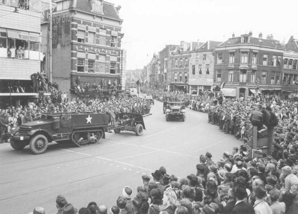 In ca. 1970 vervaardigde reproductie van een in 1945 gemaakte foto. Afbeelding van de Memorial D-Day Parade.<br/>Rode Kruis legervoertuigen van de 3rd Canadian Infantry Division in de Potterstraat te Utrecht; op de achtergrond de Voorstraat.