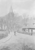 Olst: Opname van een straat in het dorp, met een huis en een kerk op de achtergrond. Op straat zijn een fietser en een voetganger te zien.