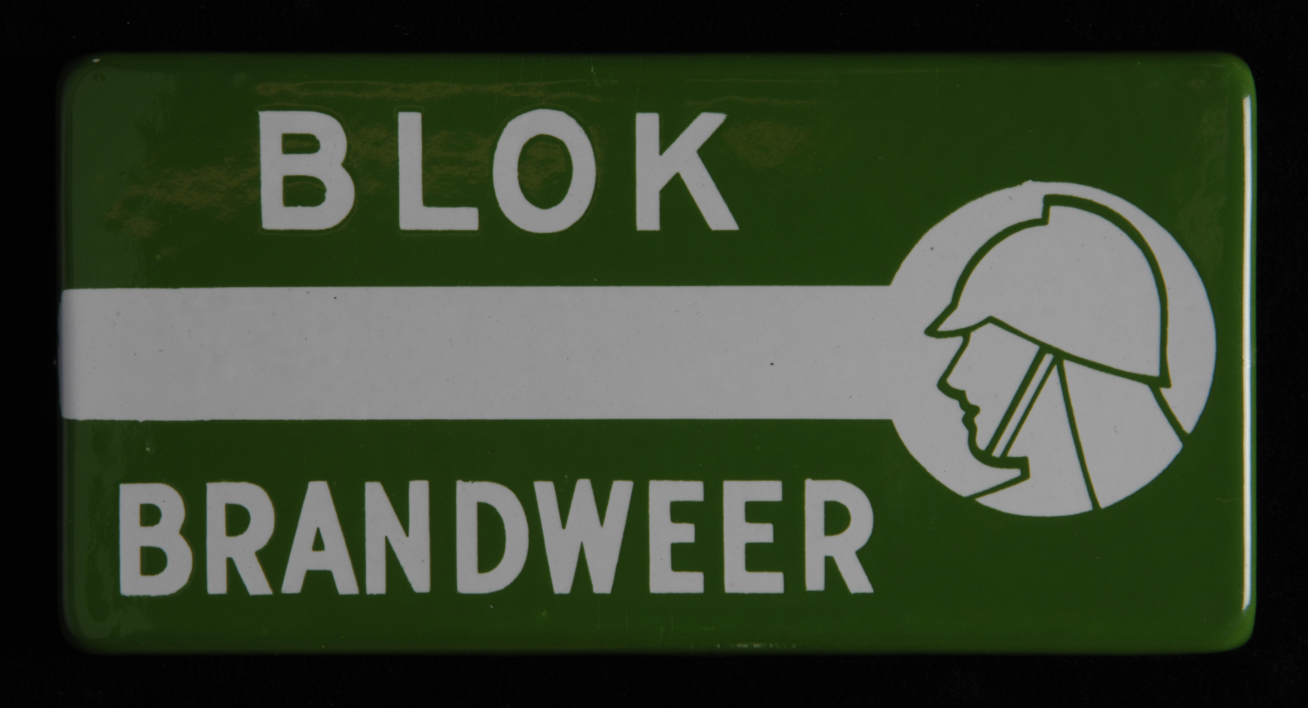 Emaille, blauw schild met diagonale band in lichtblauw en groen. Fakkel en golven, bekroond met witte "U".