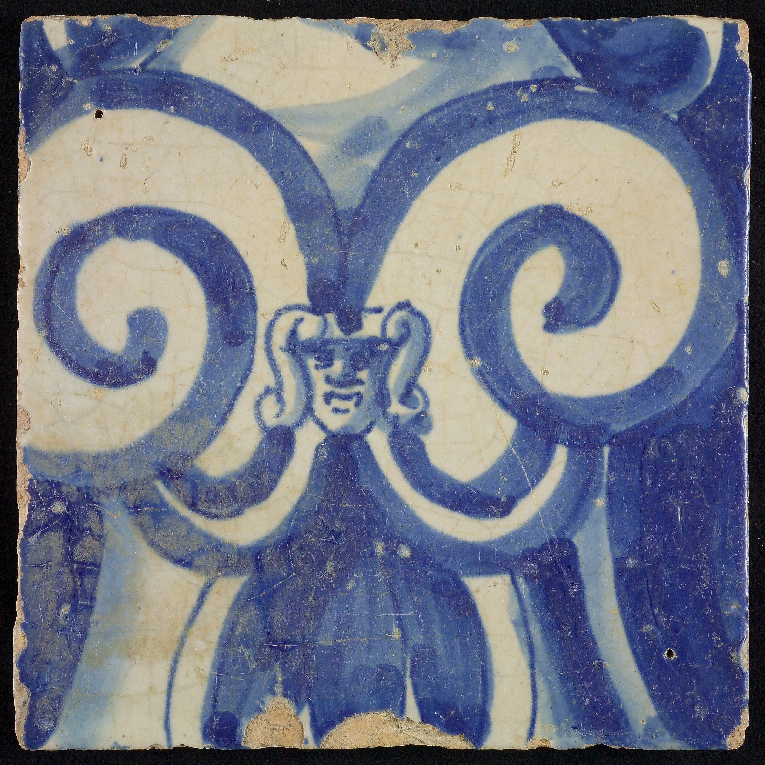 Tegel onderdeel van een schoorsteenpilaster, oorspronkelijk twaalf of dertien tegels hoog. Gele scherf, vierkant, drie spijkergaten. Blauw op wit fond. Tegel vormt onderdeel van een éénrijïge pilaster in Renaissance stijl en toont gestileerde borstkrullen, met hiertussen maskeron, van kariatide. Schaduw rechts.