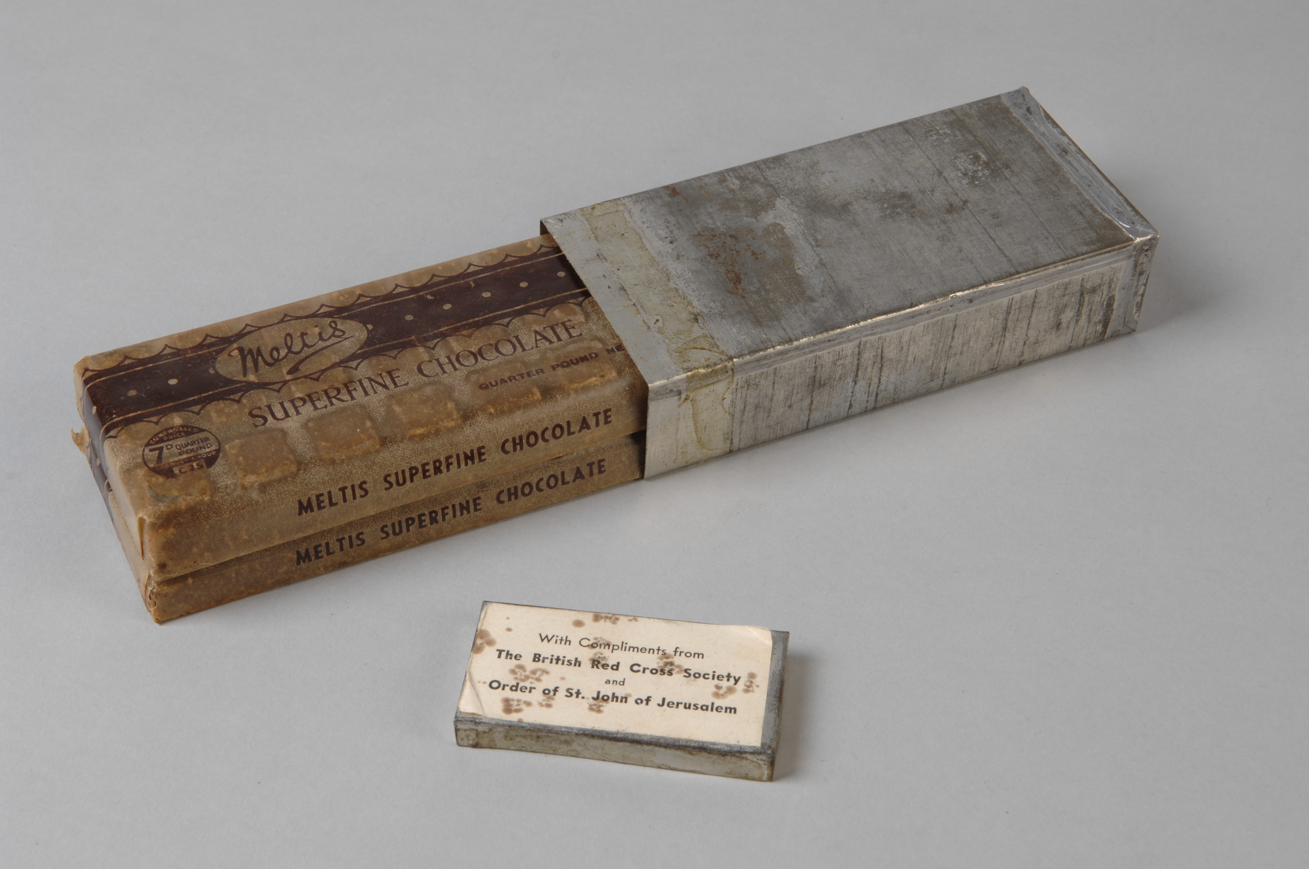 Stukje witte zeep, uit linnen zakje Rode Kruis met welkomstpakketje repatrianten