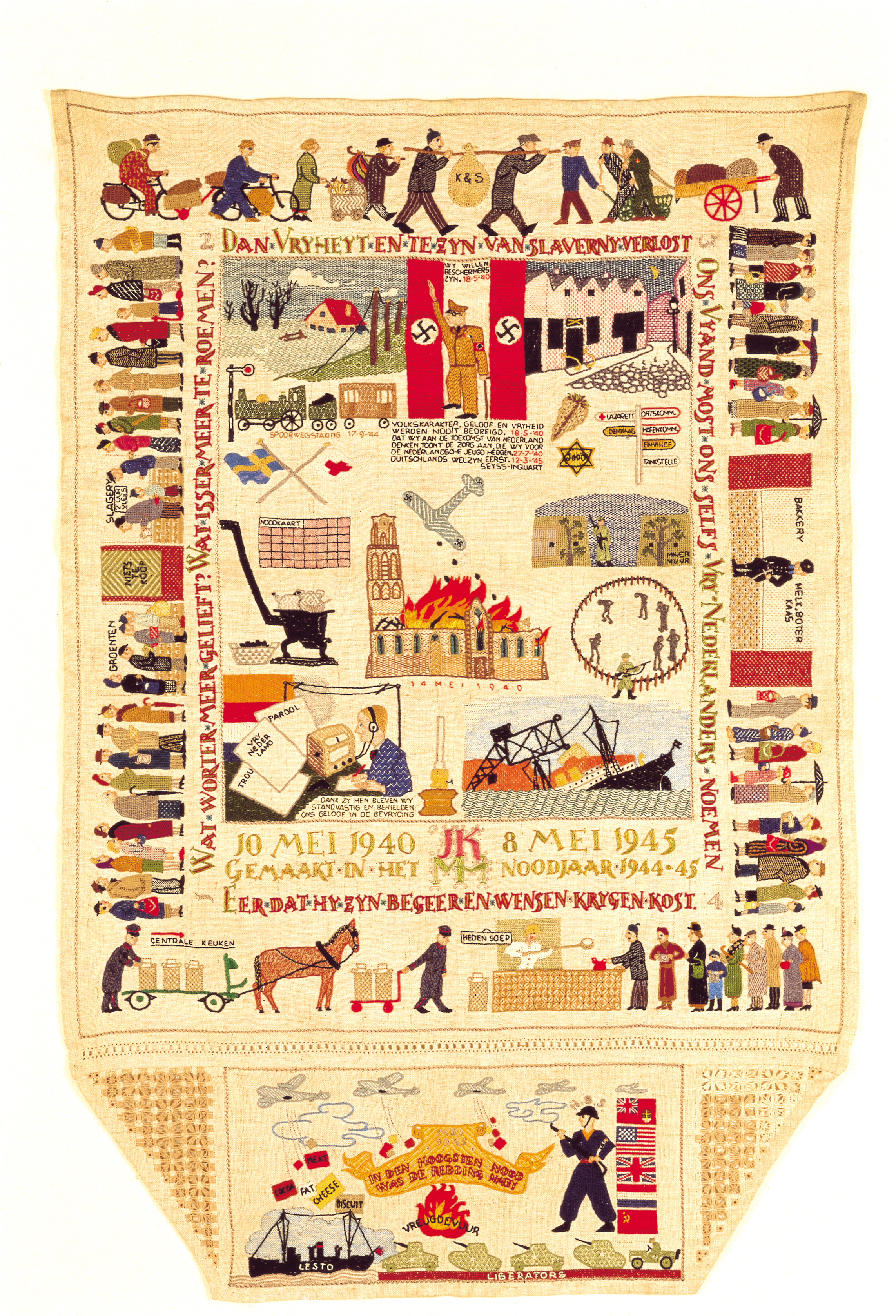 Rechthoekige borduurlap van naturelkleurig linnen met veelkleurige borduursel van voorstellingen van Nederland in de Tweede Wereldoorlog. Middenveld met oorlogstaferelen met centraal afgebeeld de brandende Laurenskerk in Rotterdam met daaronder "14 mei 1940". Rondom middenveld een tekst en langs gehele buitenrand een fries met taferelen uit het dagelijks leven in oorlogstijd. Onderaan een extra veld met tafereel van bevrijding van Nederland.
