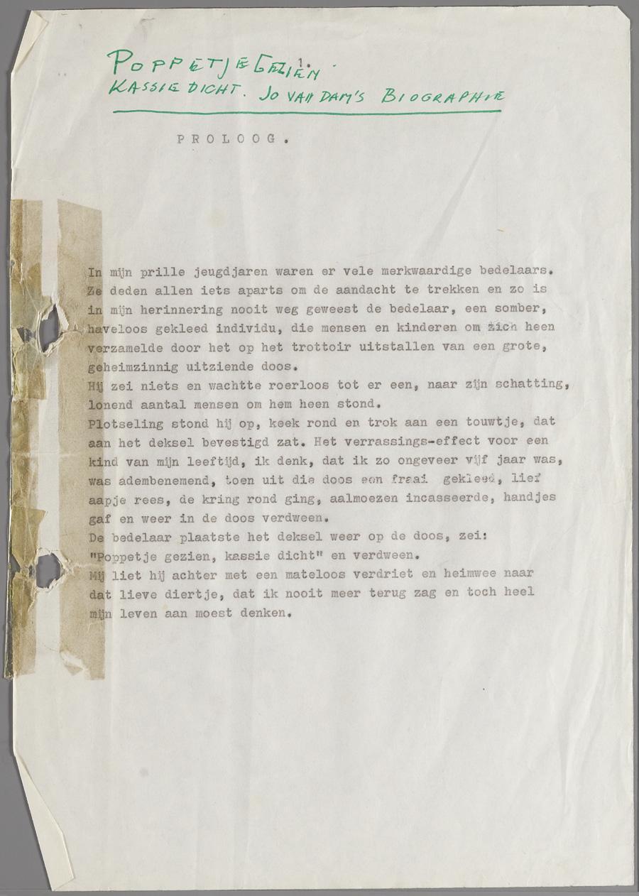 Eerste vier en laatste pagina van de jeugdherinneringen van Jo van Dam (pseudoniem!). Het gaat onder andere over zijn vader, Sam (Sammy) van Dam en zijn grootvader, Bram van Dam, die in Amsterdam in de diamant-slijperij werkte. Uitgegeven als 'Poppetje gezien, kassie dicht : het levensrelaas van een Amsterdamse jood', 1983.