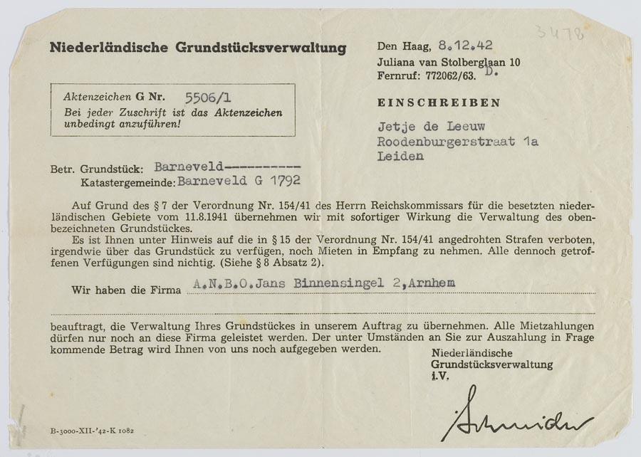 Mededeling aan Jetje de Leeuw in Leiden dat een bepaald perceel in Barneveld op grond van verordening 154/1941 in beslag genomen is en dat de firma A.N.B.O. in Arnhem als Verwalter is aangewezen, december 1942