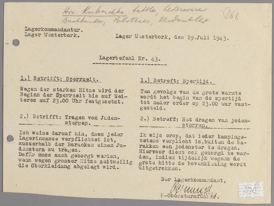 Lagerbefehl nr. 43 van kamp Westerbork, juli 1943