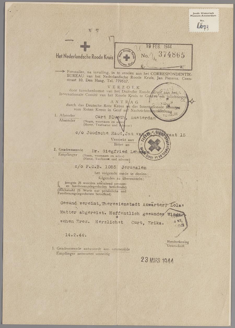 Telegram door tussenkomst Rode Kruis Geneve gezonden door Curt Blüth in Amsterdam naar Siegrfried Lehmann in Jeruzalem, 1944