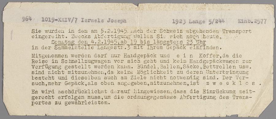Mededeling van de Duitse autoriteiten over transport naar Zwitserland op 5 februari 1945, op naam van Joseph Israels, Theresienstadt, 1945