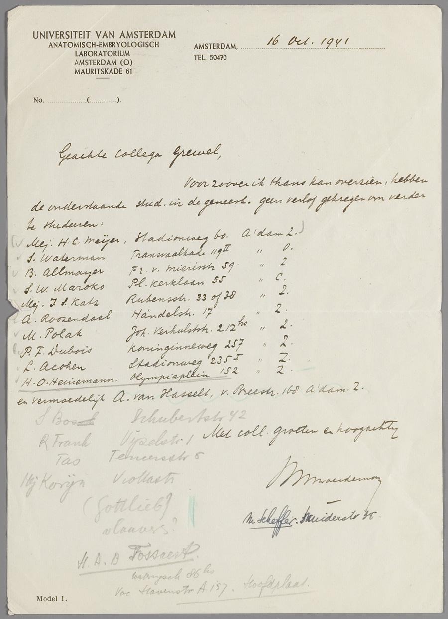 Notitie gericht aan Frits Grewel met een lijstje namen van studenten geneeskunde die uitgesloten werden van hun studie, oktober 1941
