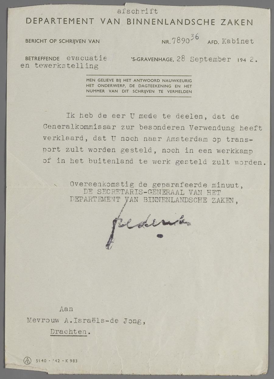 Brieven (2) van K.J. Frederiks aan Aleida Israels-de Jong en Sander Israels, betreffende plaatsing op de Barneveldlijst, Den Haag, 1942