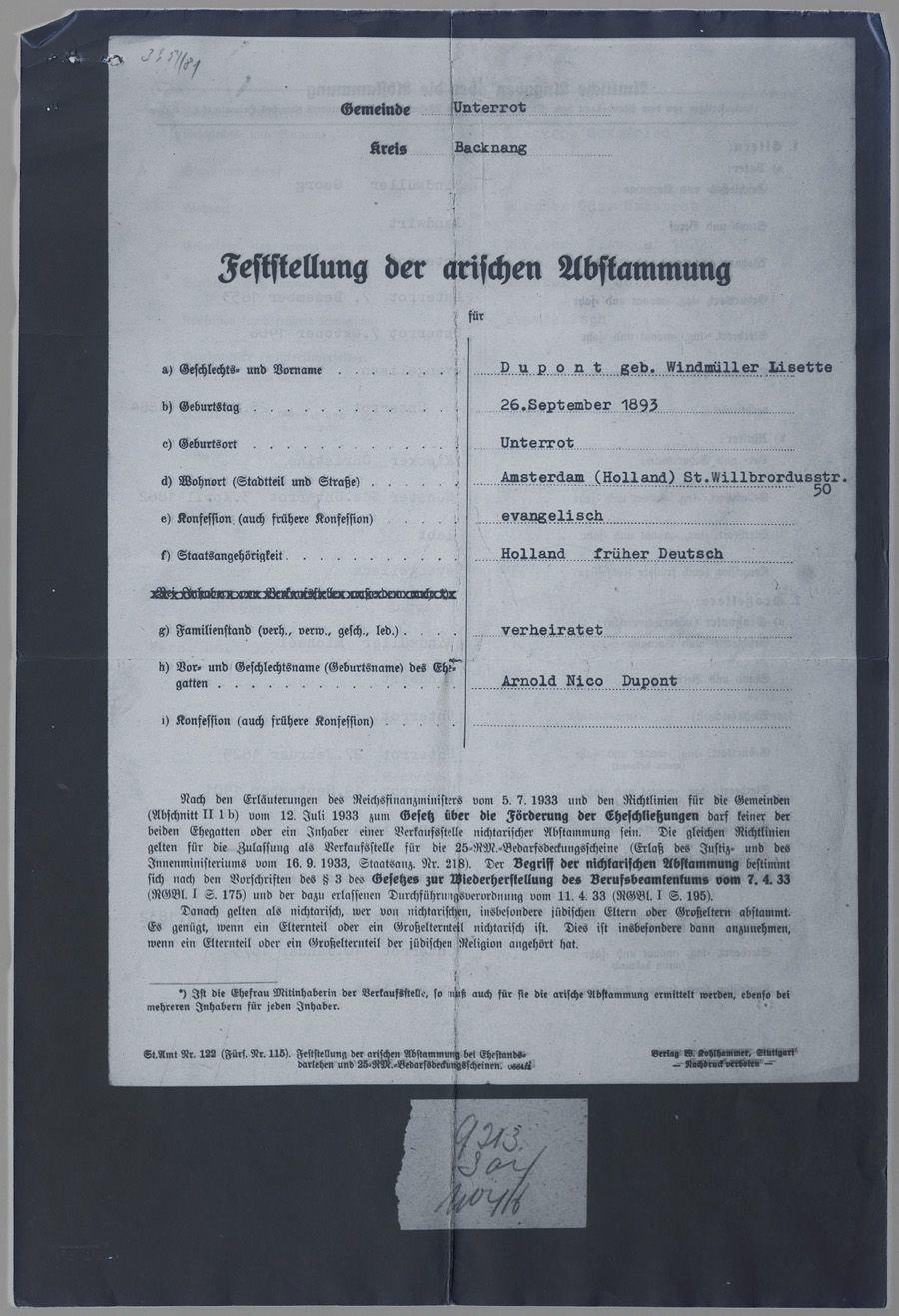 Arierverklaring van de Duitse gemeente Unterrot op naam van Lisette Dupont-Windmüller, 1942