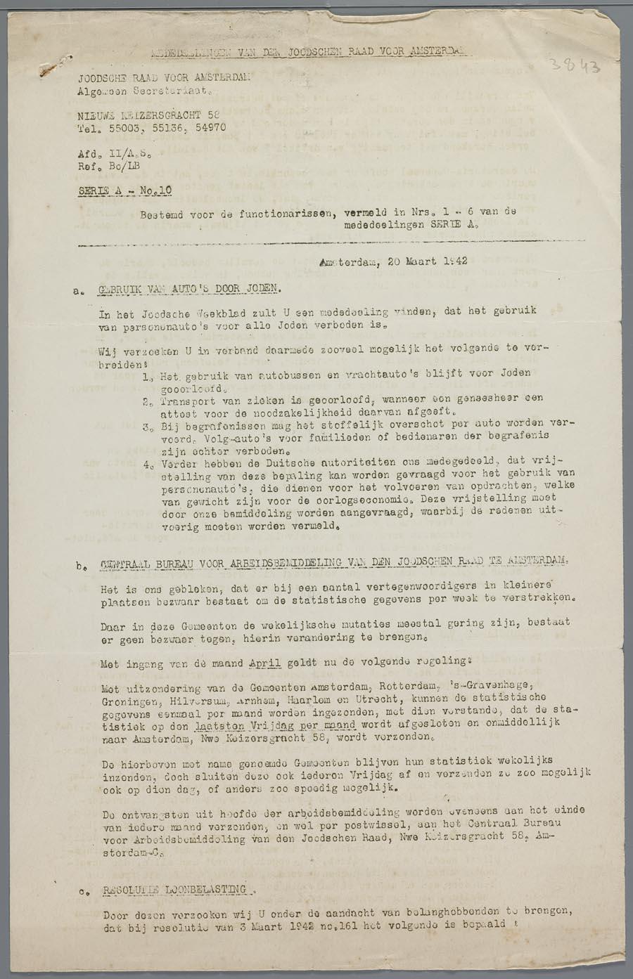 Circulaire van de Joodse Raad m.b.t. autogebruik, arbeidsplicht, emigratie en aanmeldingsplicht, maart 1942