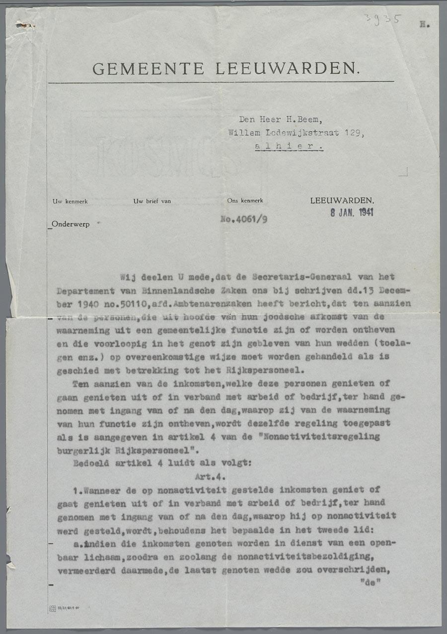 Brief van de Gemeente Leeuwarden aan Hartog Beem, over zijn ontslag en de uitkering aan joodse ambtenaren, januari 1941