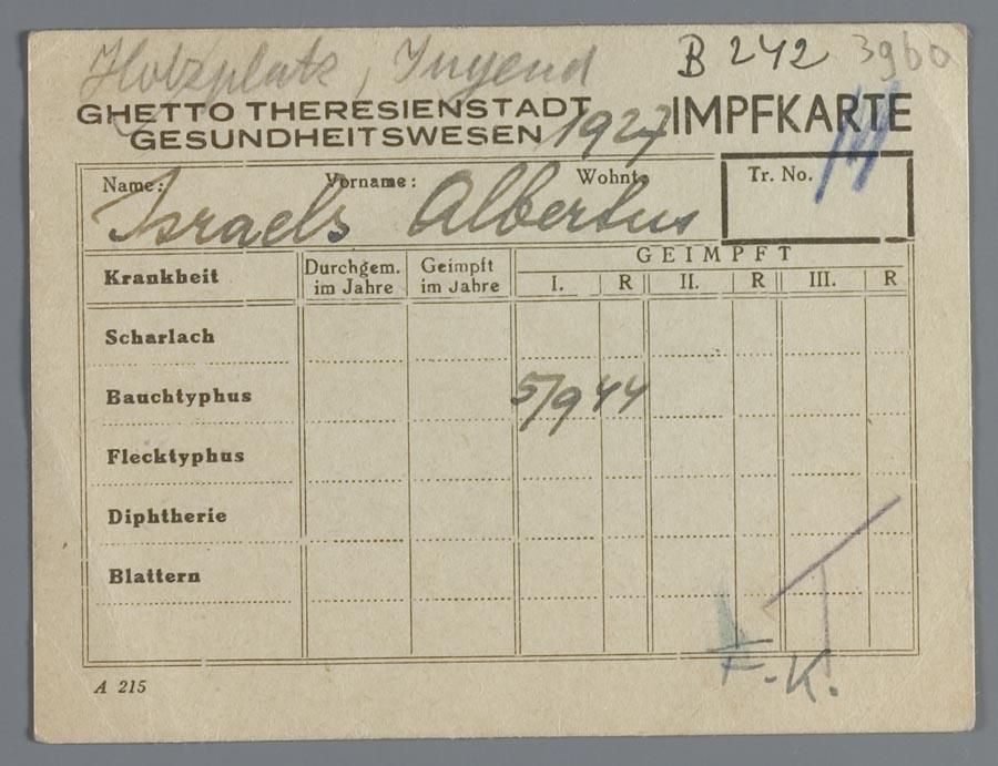 Inentingskaart van Theresienstadt op naam van A.L.M. Israels, 1944